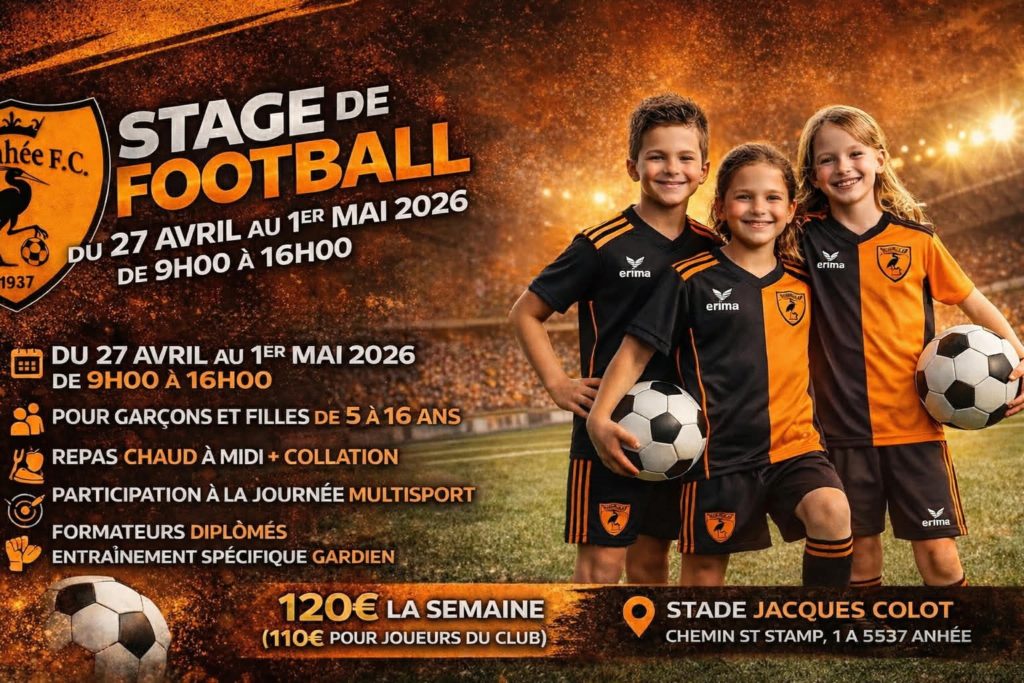 27Avr Stage de printemps 2026 6 janvier 2026Annonces , Evènements , News Du lundi 27/04 à 8:00 au vendredi 01/05 à 16:00 Royal Anhée Football Club, Rue du Petit Bois, Anhée, Belgique